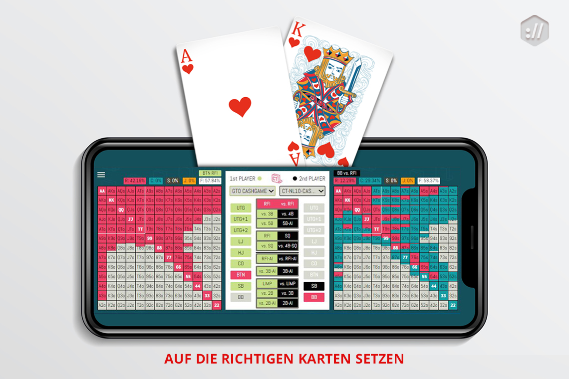 Wir haben mit unserem digitalen Poker-Assistenten nun ein interaktives Tool geschaffen, mit dem sich dieses Ziel leichter erreichen lässt. Das Programm schärft das Verständnis für die Grundlagen und den Umgang mit den ersten und wichtigsten Weichenstellungen bereits am Anfang des Spiels. Es vermittelt dabei nicht nur eine Entscheidungsgrundlage auf Basis der GTO-Spieltheorie, sondern auch das Handwerkszeug zum einfachen Erlernen und Verstehen der strategisch besten Spielzüge. Auf diese Weise können Strategien in verschiedenen Spielsituationen für das Cash-Game und Multi Table Turniere für Online-Poker ebenso wie für Live-Poker, erlernt und optimiert werden. Ein Zeitvertreib, der mehr ist, als nur eine Spielerei. Denn dabei lernt man, auch komplexe Herausforderungen durch gebotene Vereinfachung und rationale Verhaltensweisen besser zu beherrschen.