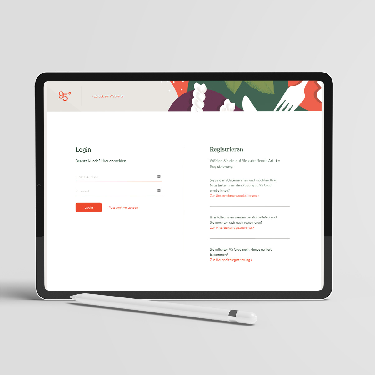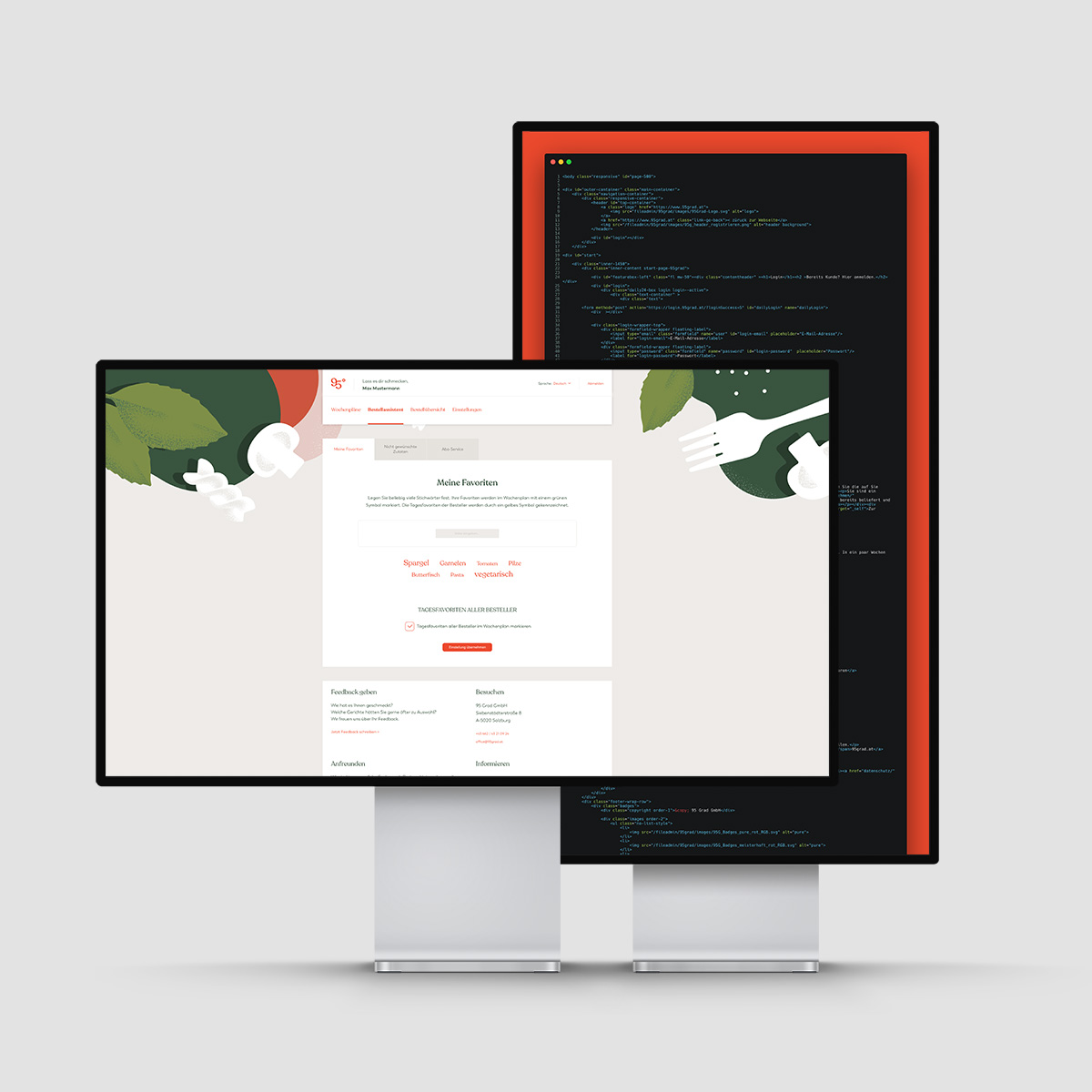 Der öffentlich zugängliche Teil der Website wurde von BlueChip umgesetzt, wobei unter anderem das operationskritische Bestellsystem im eingeloggten Bereich von Grund auf von uns überarbeitet wurde. Login und Registrierung für die verschiedensten Kundenarten wurden ebenfalls von Connetation neu formatiert, gemeinsam mit einer Umstellung der Domains, um die Benutzerfreundlichkeit weiter zu steigern. So können Kunden sich nun über login.95grad.at einloggen oder einen Account anlegen. Um die komplette Kundenkommunikation auch auf den neuen Standard zu heben, wurden auch sämtliche automatischen Emails, wie zum Beispiel der Wochenplan, an das neue Design angepasst.