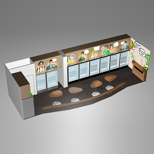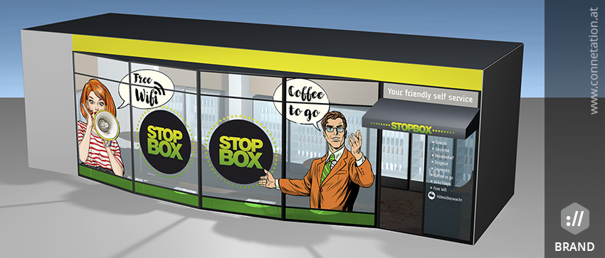 Du fährst hin, bleibst stehen (Stop), holst dir einen Kaffee und vielleicht noch eine Semmel oder Schokolade und fährst wieder weiter. Daher der Name Stopbox. Die „Box“ ist ein auffällig gestalteter Store mit mehreren Automaten zur Selbstbedienung sowie einigen Tischen und Stühlen. Vorteil: Das Konzept kommt ohne Mitarbeiter aus und hat dennoch den Charme eines modernen Cafés. Bei Grafik und Logoentwicklung orientierten wir uns an der Comic-Welt, um ein auffallendes und fröhliches Design zu schaffen. Das Konzept ist so erfolgreich, dass der Kunde bereits über ein Franchise-System nachdenkt.