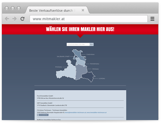 Bei der Umsetzung der Landingpage wurde sehr eng mit der Fachgruppe der Immobilien- und Vermögenstreuhänder der Wirtschaftskammer Salzburg zusammengearbeitet und ein Datenaustausch der aktuell registrierten Makler für die Landingpage integriert und umgesetzt. Die Offline-Kampagne wurde von der X-Werbeagentur – Gerhard Gimona - gestaltet und betreut, welche connetation im Online-Bereich weiterführt und ergänzt.