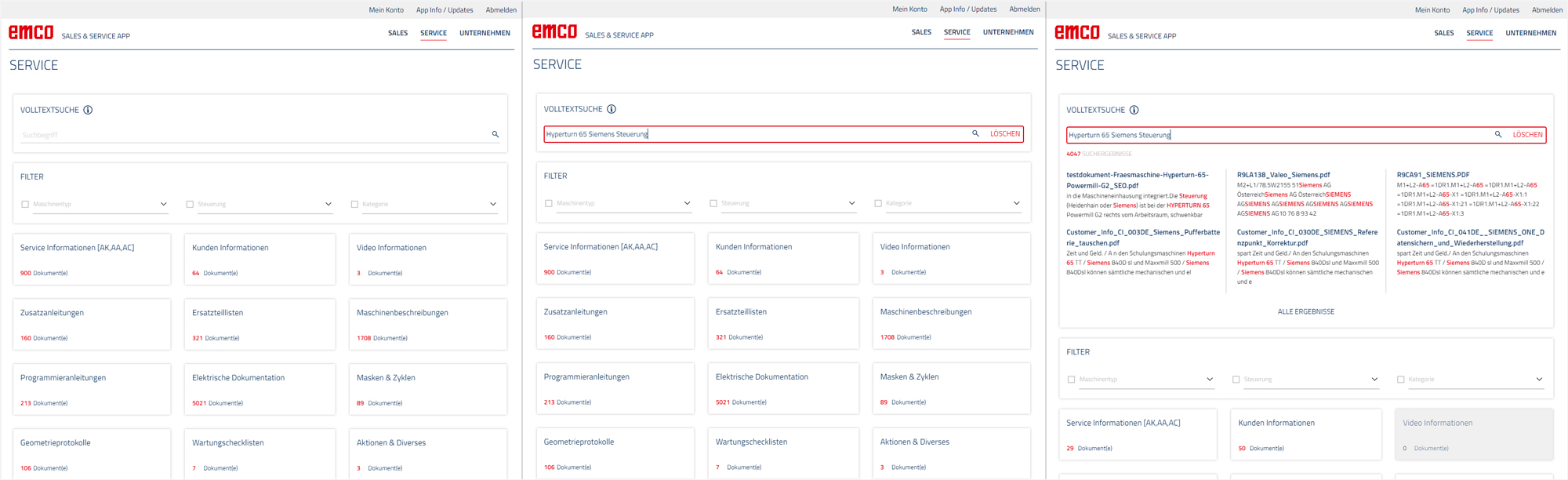 In Zusammenarbeit mit der Service- und Marketing-Leitung von EMCO wurde das vorhandene Webdesign für die mobile Service-App Screen für Screen adaptiert. Jede Interaktion des Benutzers, unabhängig von Bildschirmgröße oder Endgerät, wurde überdacht und neu inszeniert. So können nun zum Beispiel Dateien direkt auf das Gerät abgespeichert oder in einem neuen Browserfenster geöffnet werden.